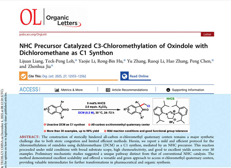 近日,我院罗德平院士团队在国际学术TOP期刊Organic Letters (中科院TOP一区)在线发表题为“NHC Precursor Catalyzed C3-Chloromethylation of Oxindole with Dichloromethane as C1 Synthon” (Org. Lett. 2025, 27, 12555-12562.) 的研究性论文,前沿交叉科学与技术学2024级博士研究生梁利娟为第一作者,罗德平院士、胡荣斌博士、陈朋博士和贾振华教授为共同通讯作者,河南工业大学为第一署名单位。